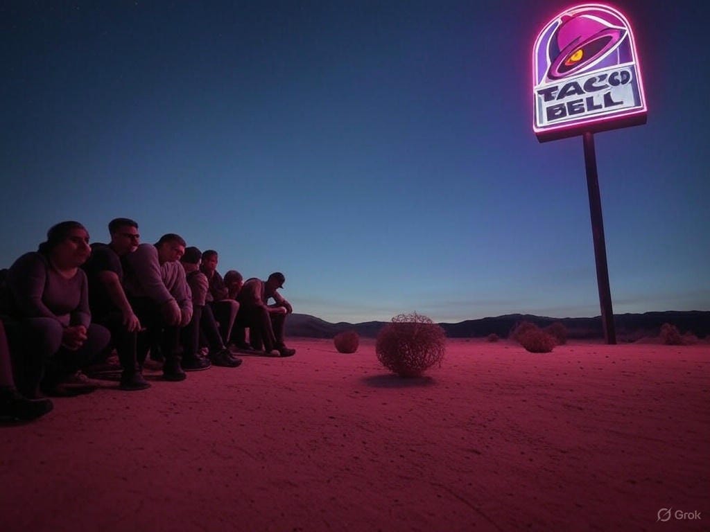 The journey was harrowing, I’m not sure how many of us made it. There is no way to know for certain, we had lost too many to distinguish the casualties from the deserters. None of us knew how much longer we had, not until we saw the beacon. The shining, shimmering light. It drew us in, called to us. Its sweet beckon lulled us into a renewed sense of purpose. We had a mission. The letters shown brightly: Taco Bell.